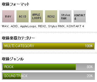 ドラマチックなストーリー展開を後押ししてくれるロックサウンドが欲しかったプロデューサーの方にオススメの一枚! 【収録内容】 ・16種類のコンストラクション・キット収録 ・キット内で収録されたサウンド Drum, Bass, Guitar, Organ, Piano, Percussion等 ・テンポレンジ=61BPM〜187BPM ・収録形式:Wav(Acidized), Apple Loops, REX2, Stylus RMX, KONTAKT(4.2以上) ・総容量:約9.58GB/DVD-ROM2枚 【収録フォーマット】 WAV、ACID、AppleLoops、REX2、Stylus RMX、KONTAKT 4 【収録楽器カテゴリー】 Multi Category (100%) 【収録ジャンル】 ROCK (80%) SOUNDTRACK (20%)