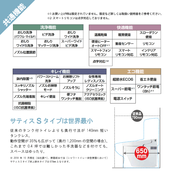 ・シャワートイレ機能が内臓された、シャワートイレ一体型便器 ・シャワートイレ基本機能搭載(暖房便座・脱臭機能・他...) ・汚れがつかない『アクアセラミック』が標準装備 【品番】 ・便器:YBC-S30PMF ・機能部:DV-S725PM 【グレード別機能SM5】 ・フルオート便器洗浄(リモコン便器洗浄)※男子小洗浄対応なし ・エアシールド脱臭 【必要最低水圧 サティスSタイプ】 ・ブースターなしの場合:0.07MPa以上(17L/分以上流動時) ・ブースター付の場合:0.05MPa以上(13L/分以上流動時) 0.15MPa以上(静水圧) ※ブースター付でも、最低作動水圧を下回った場合は設置出来ません。