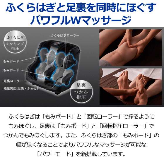 ・・・・・・・・商品特長・・・・・・・・ マッサージサロンのように 脚を集中ケア 新機能!パワーモードとふくらはぎつかみ 指圧マッサージ(回転ローラー)搭載!! ◎ポイント ・パワフルWマッサージ ・パワーモード ・かんたん操作km ・2段階の角度調節 ・手洗い可能なカバー ・より省エネ、コンパクトに進化 ◎ふくらはぎと足裏を同時にほぐす ふくらはぎは「もみボード」と 「回転ローラー」で搾るように もみほぐし、足裏は「もみボード」と 「回転指圧ローラー」でつかんで もみほぐします。